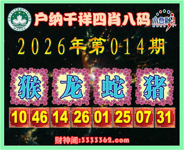 014期:《户纳千祥》 🏇四肖八码🏇【猴蛇猪】开:龙26